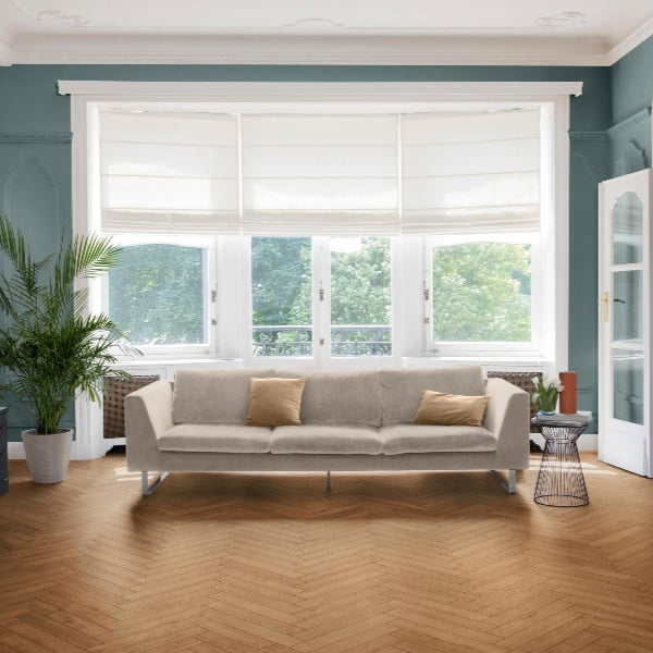 Laminaat Visgraat Hydro+ Chateau Texas Light Brown B 62002727 is een expressieve eik met een matte afwerking en een rijke houtstructuur in een lichtbruine kleur. De 50,4 centimeter lange vloerdelen hebben een breedte van 8,4 centimeter en een dikte van 8 millimeter. Deze visgraatvloer is voorzien van een 4-zijdige microvelling V-groef, waardoor de planken nauwelijks van echt hout te onderscheiden zijn. Met gebruiksklasse AC5/23 is de vloer geschikt voor zowel residentieel als licht commercieel gebruik. De waterafstotende coating beschermt de plankranden, zodat vocht geen kans krijgt. De vloer is geschikt voor vloerverwarming en vloerkoeling en wordt geleverd met een levenslange fabrieksgarantie. Laminaatvloeren van BerryAlloc zijn onderhoudsvriendelijk, krasvast, vlekbestendig, antistatisch en eenvoudig zelf te leggen dankzij het unieke clicksysteem.